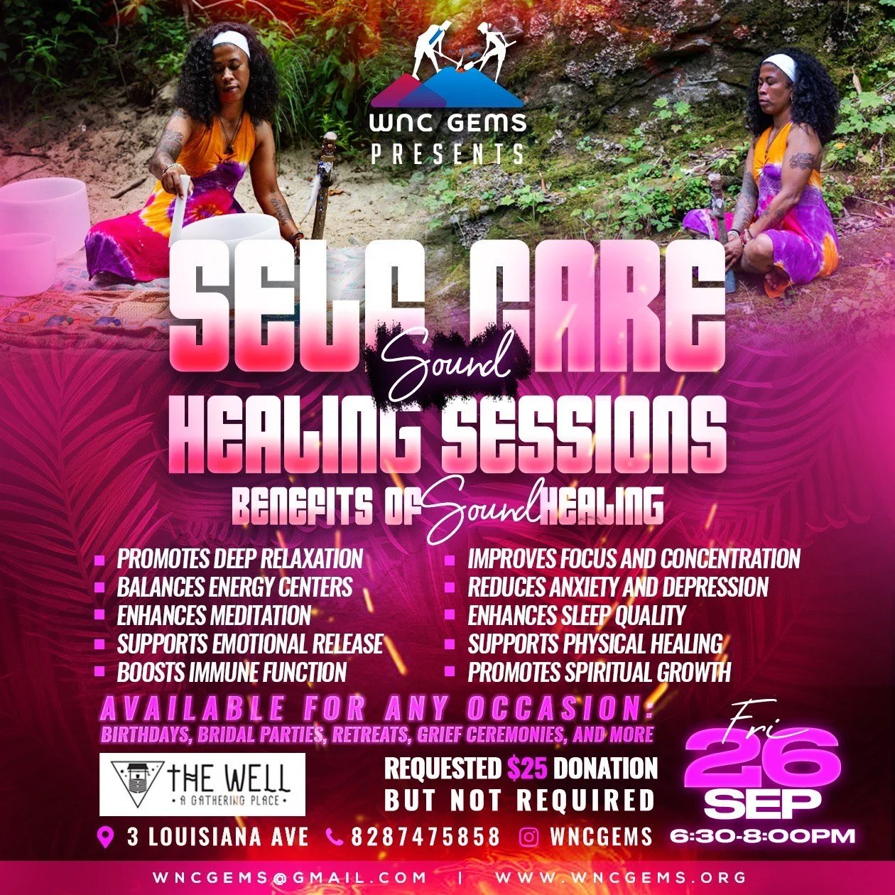 I offer these sessions with a suggested $25 donation, which can be made through Cash App, PayPal, or cash. However, please know that no one will be turned away due to financial constraints. My intention is for everyone to be able to relax, reset, and honor themselves. Come as you are, and allow yourself to reconnect, recharge, and nurture your nervous system. You deserve it.